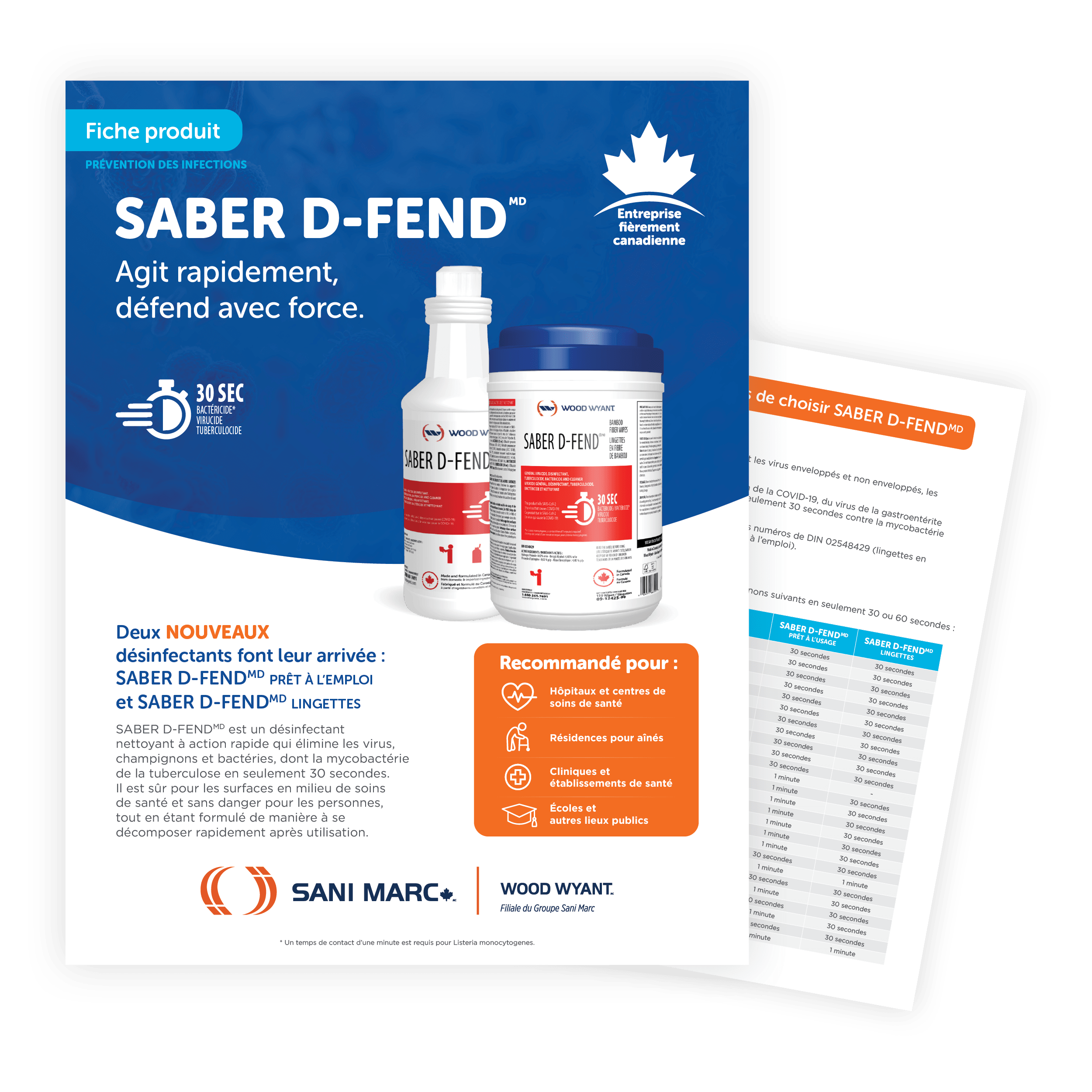 SABER D-FENDMD est un désinfectant nettoyant à action rapide qui élimine les virus, bactéries et champignons, dont la mycobactérie de la tuberculose en seulement 30 secondes*. Il est sûr pour les surfaces en milieu de soins de santé et sans danger pour les personnes, tout en étant formulé de manière à se décomposer rapidement après utilisation.