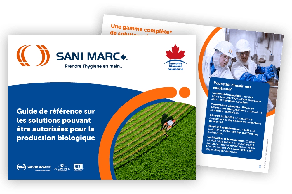 Sani Marc vous offre la première gamme complète de solutions de nettoyage et d’assainissement* approuvées par Ecocert pour le secteur agroalimentaire au Canada